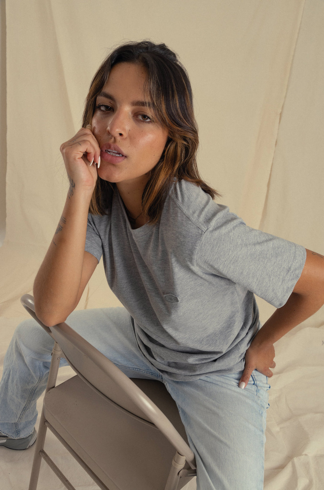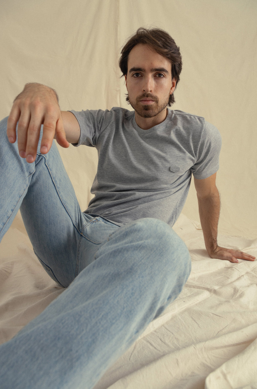 • Bordado insignia tono a tono en punto corazón.